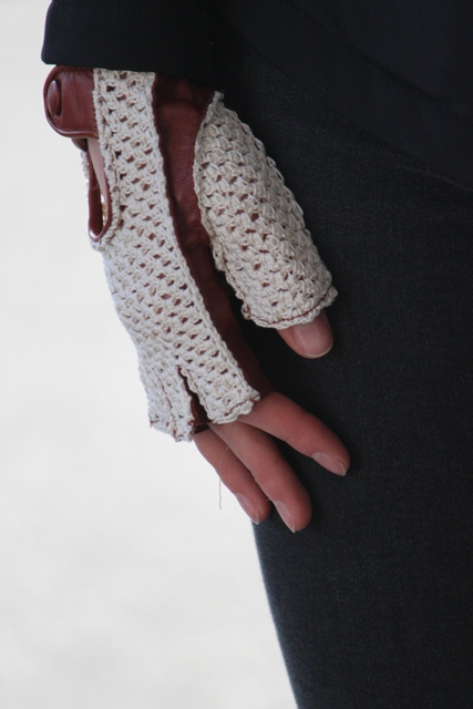 Cotton crocheted back, push button at the top, available in the colors dark brown and saddle brown also saddle brown halfinger