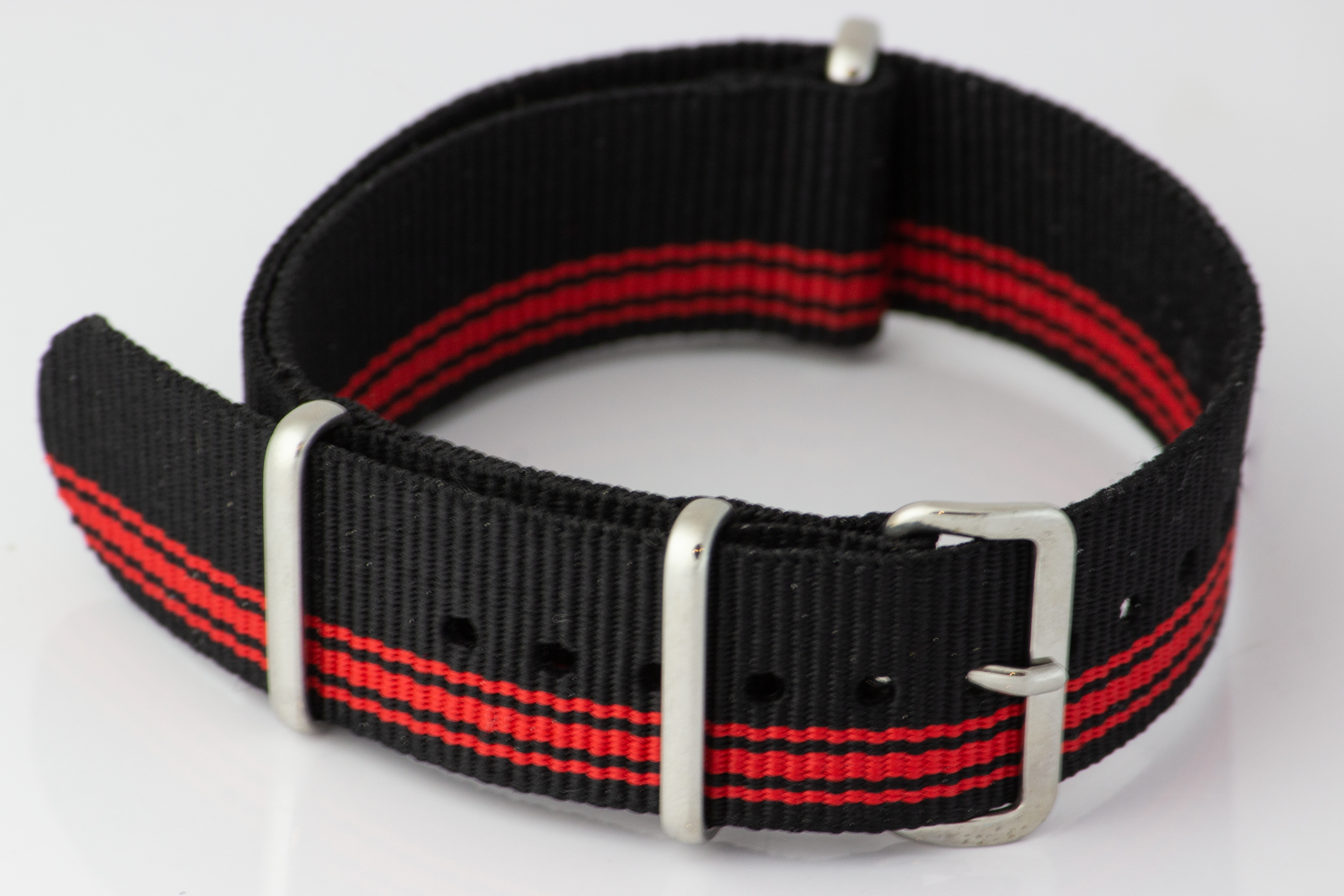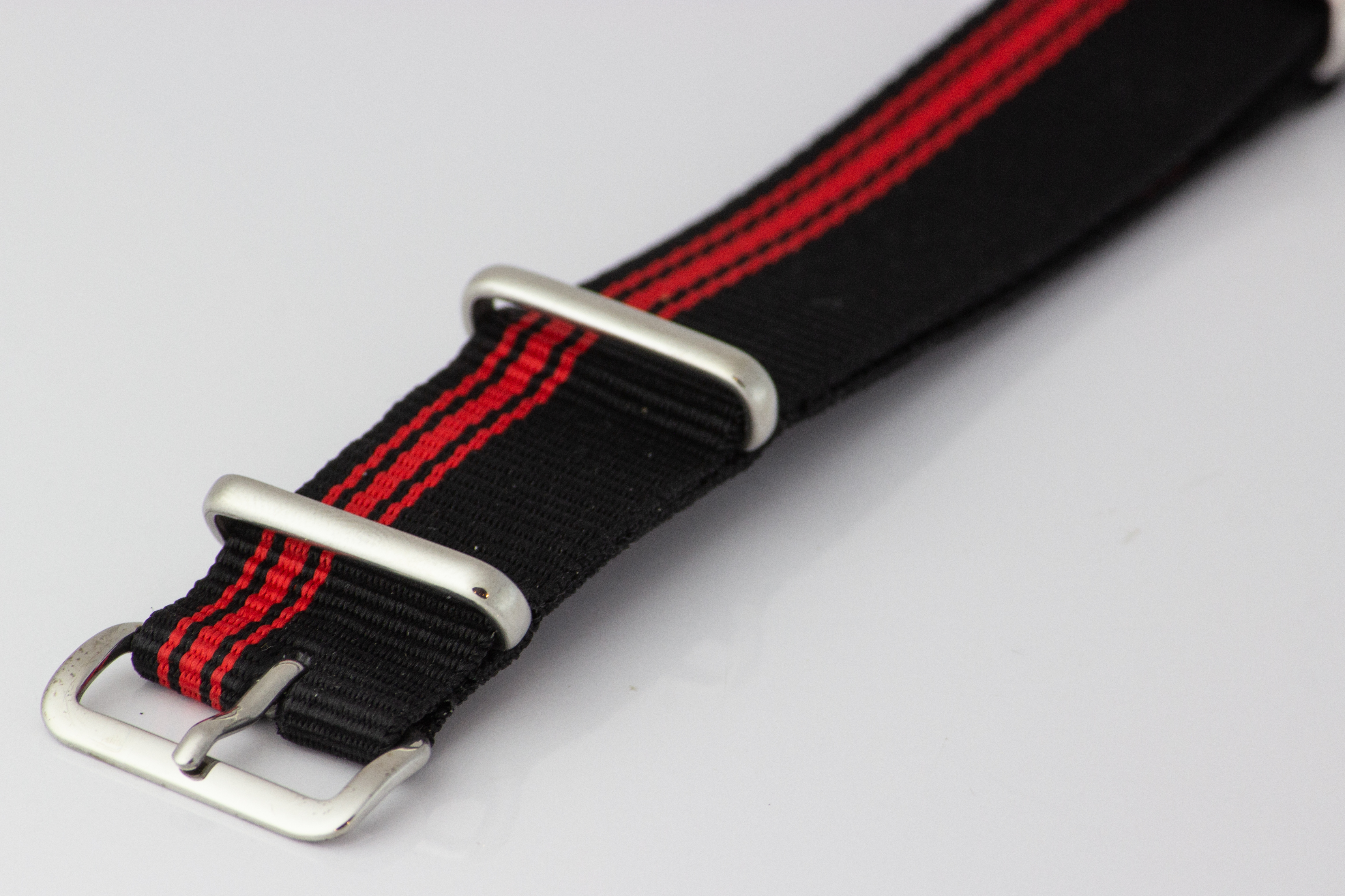 Textilband aus gewebtem Nylon in schwarz mit roten Streifen mit der Ansatzbreite von20mm oder 22mm, Länge ca.27,5 mm.