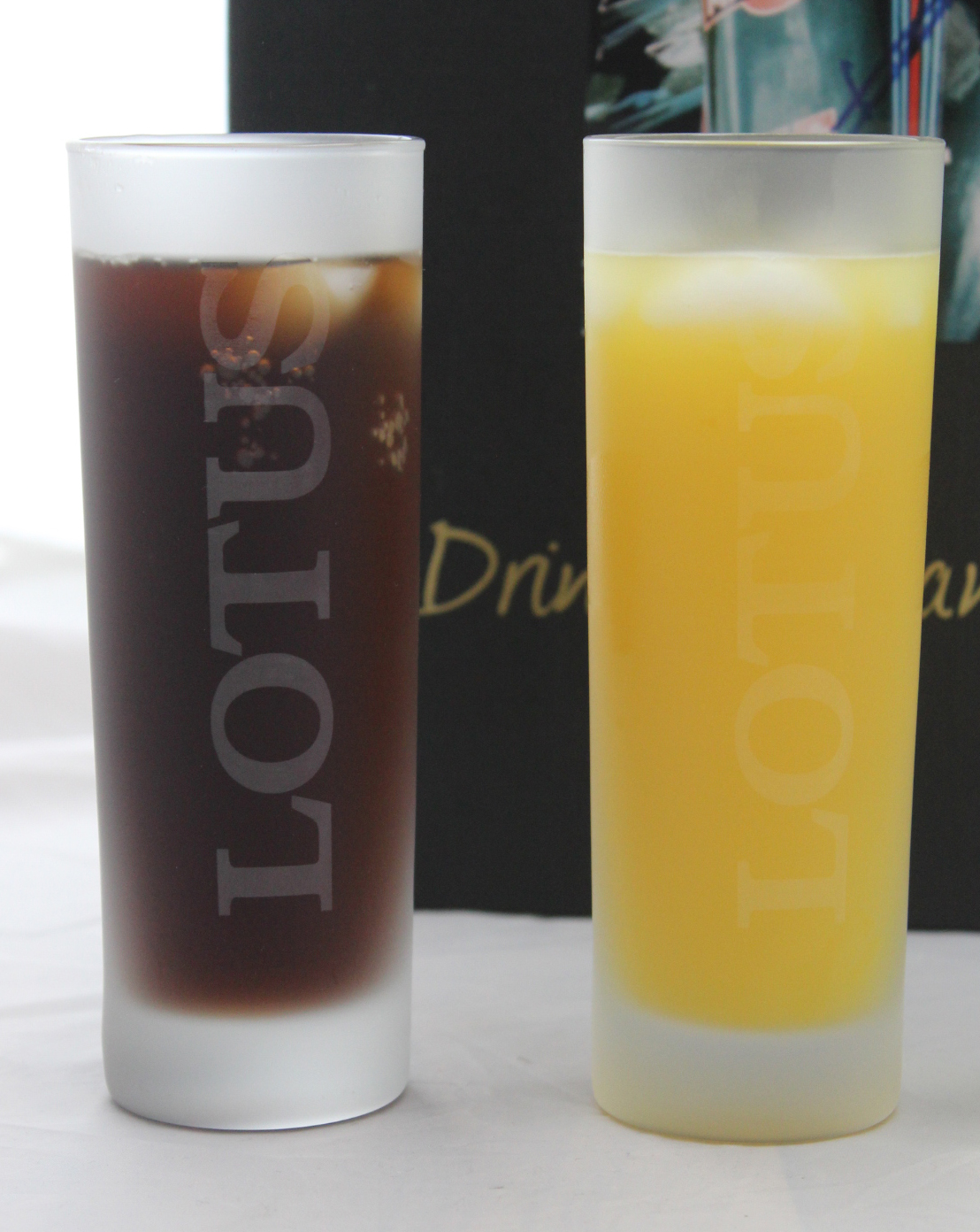 Coole Longdrinkgläser für leckere Drinks im frosted Look mit durchsichtigem Lotus Schriftzug.