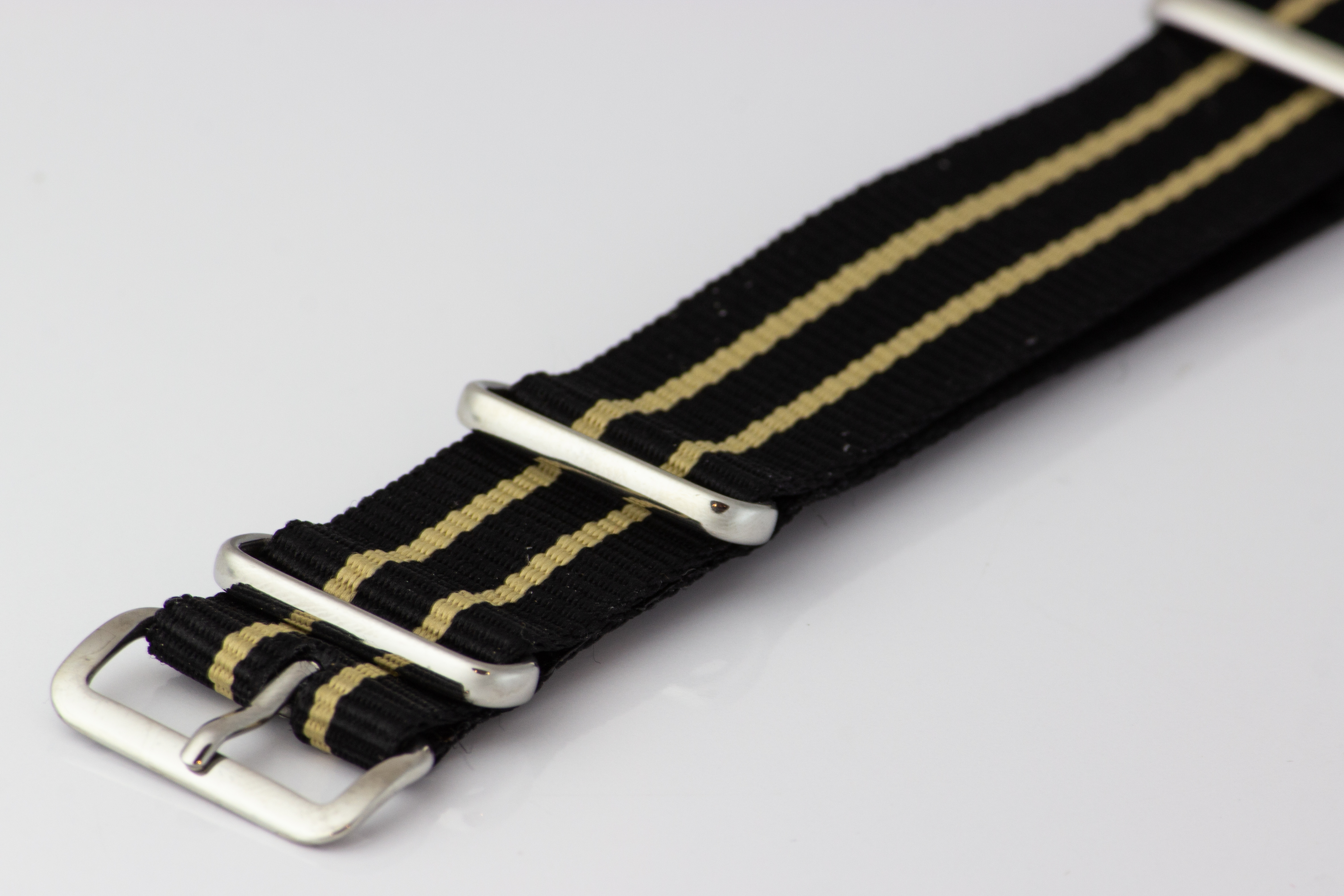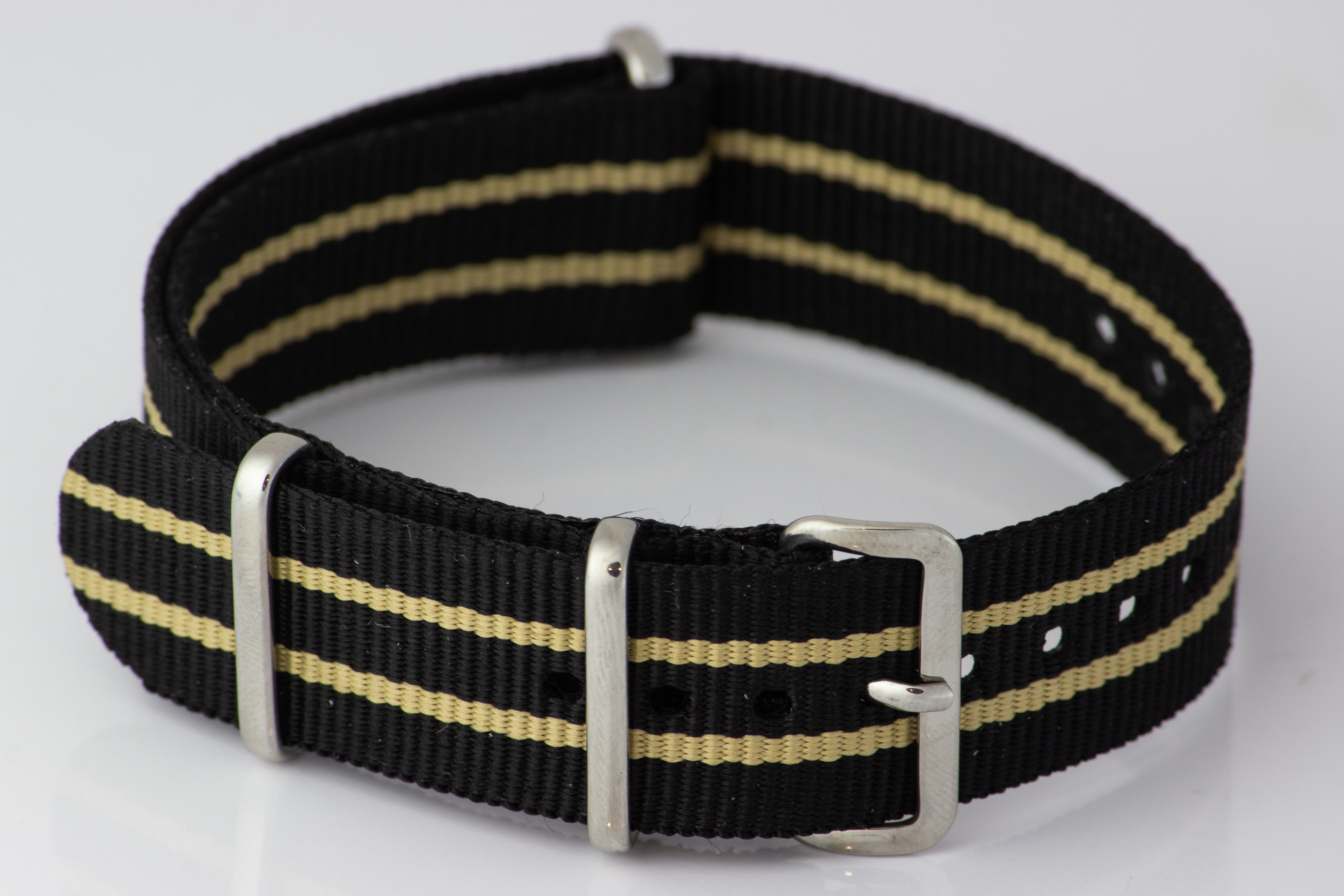 Textile tape made of woven nylon in black with two stripes. Available in widths 20mm or 22mm length ca.27.5 mm.