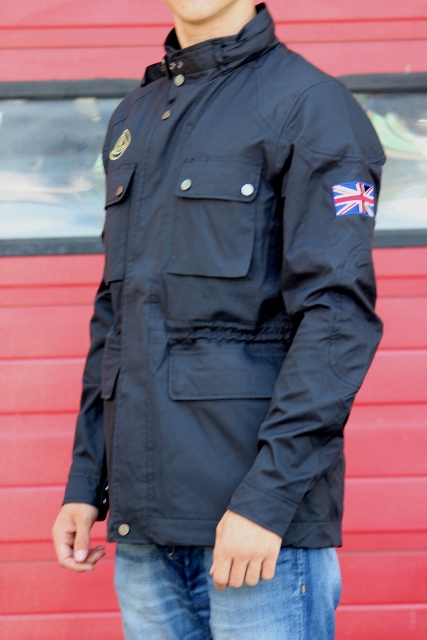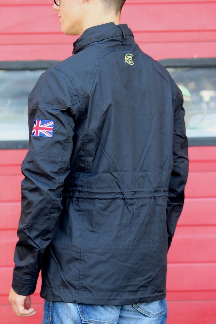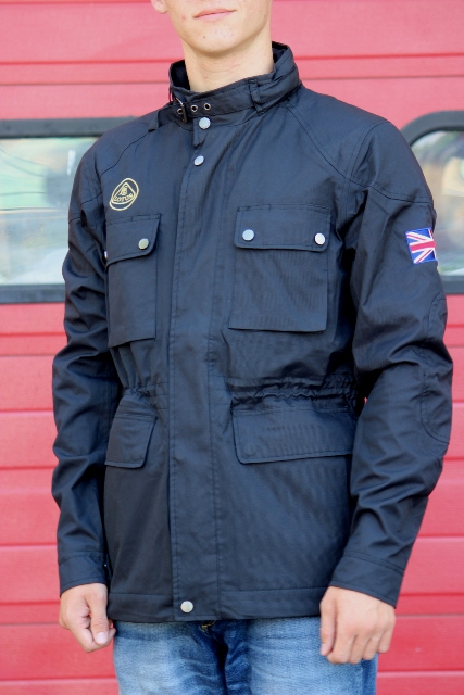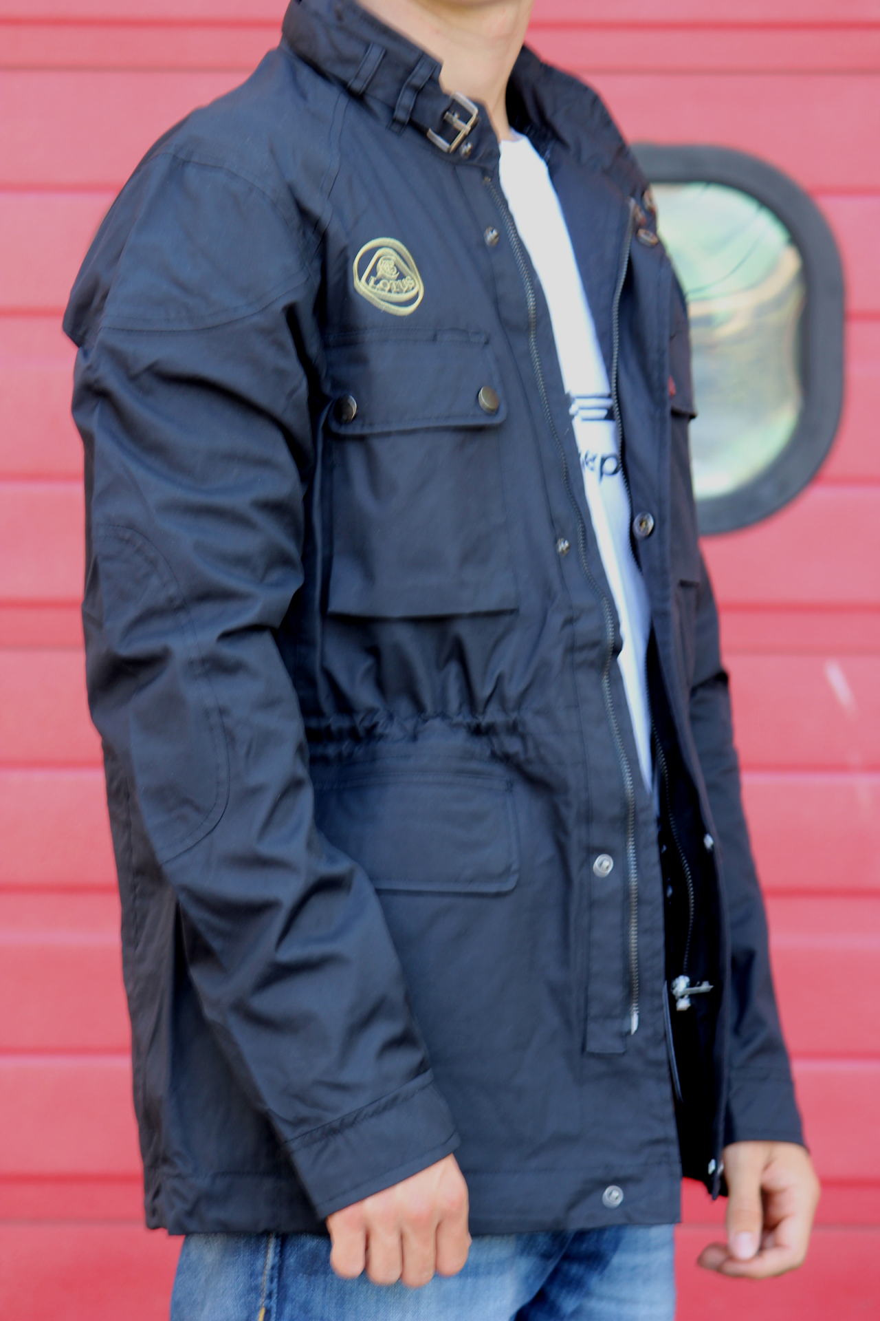 Biker Vintage jacket short parka cut with various pockets and press studs, concealed front zipper and press studs, small stand-up collar with hidden hood, elbow patches, press studs on the arm closures, with embroidered Union Jack on the arm, Lotus logo on the chest and lotus initials on the neck.