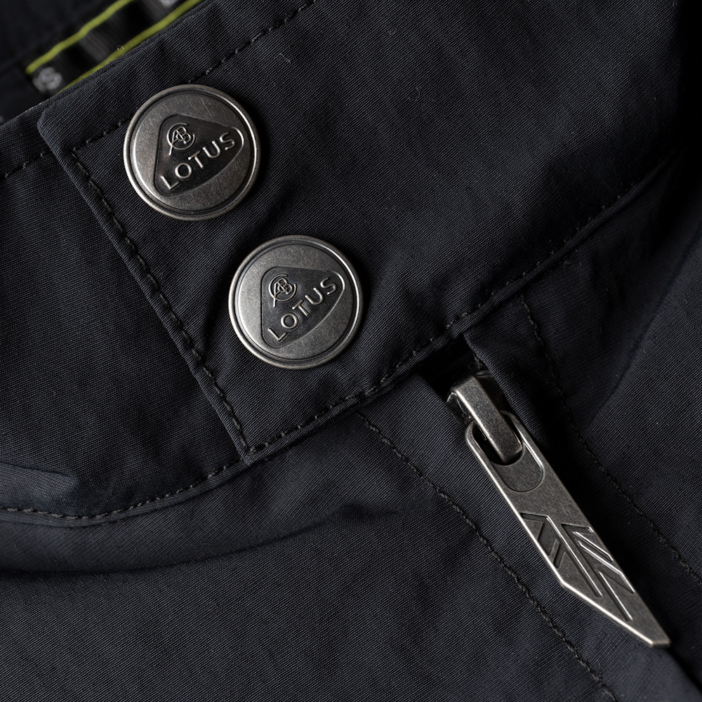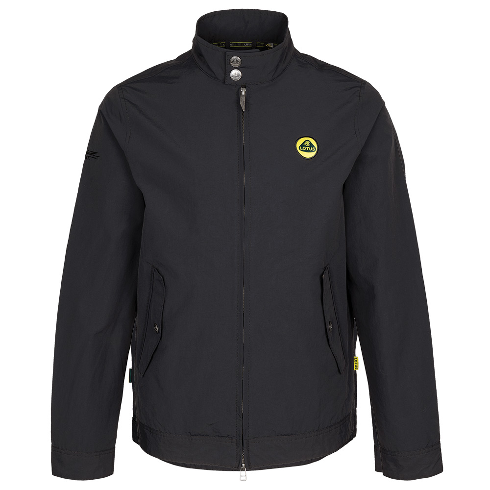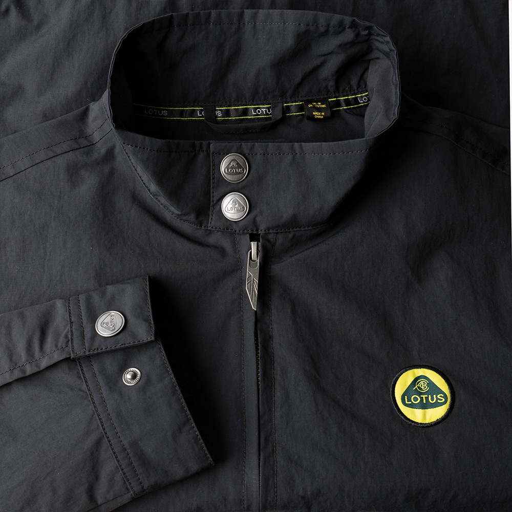 Light casual jacket in black with the Lotus Roundel on the chest. The jacket has a zipper in the front and snaps on the sleeves and waistband to adjust the size.