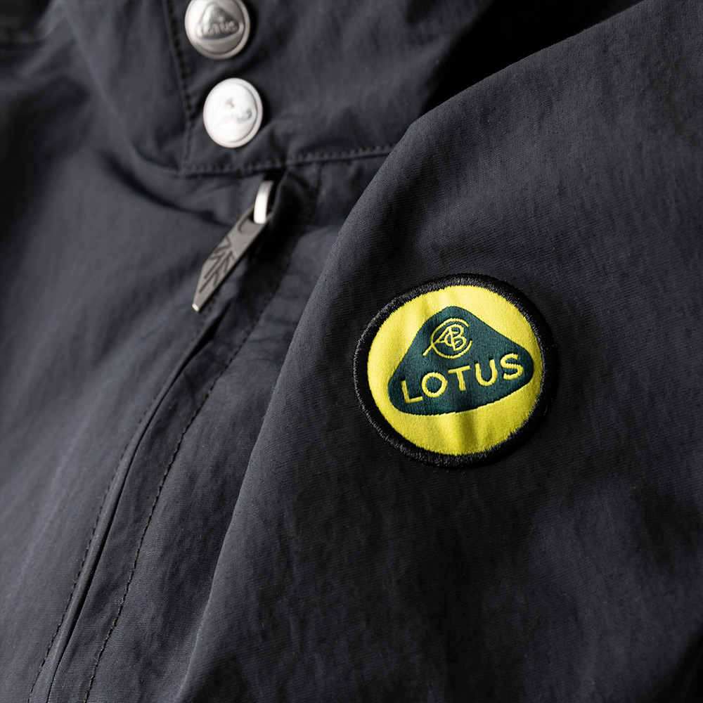 Leichte Jacke in schwarz mit genähtem Lotus Roundel auf der Brust. Die Jacke hat Reißverschluß vorne und Druckknöpfe an Ärmeln und Bund um die Weite zu regulieren.