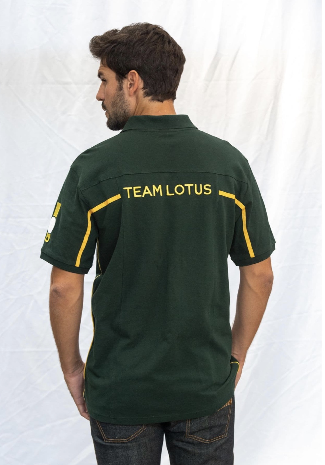 Classic Team Lotus poloshirt colord with the traditional racinggreen an yellow like Jim Clarks Racecar. With high quality embroidered Lotus Logo and CTL Logo on the chest, as the Colin Chapman victory silhouette on the sleeve and Team Lotus lettering on the Back.