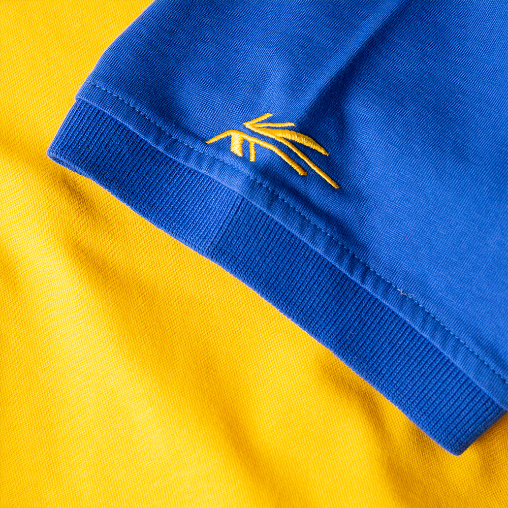 Zweifarbiges Polo-Shirt in gelb/blau mit Lotus Schriftzug an der Seite, Stickerei am Ärmel und Lotus Logo auf der Brust.