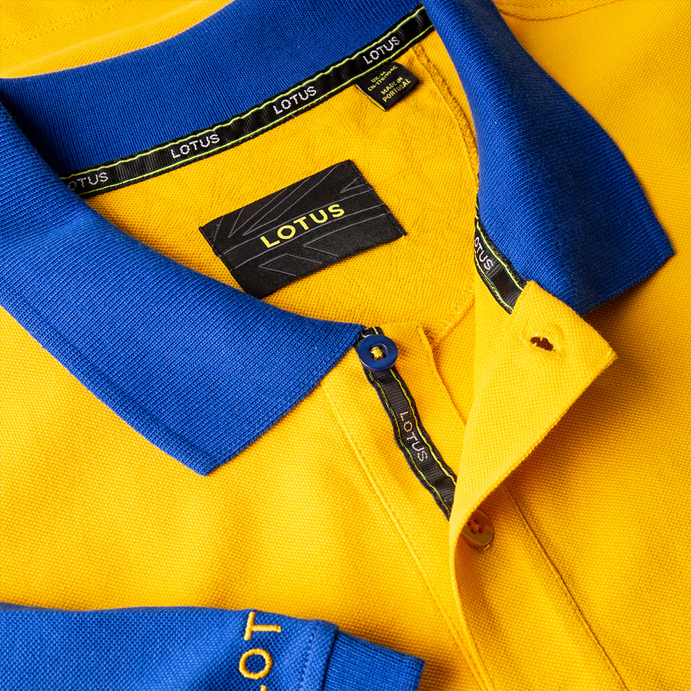 Two-tone polo shirt in yellow / blue with Lotus lettering on the side, embroidery on the sleeve and Lotus logo on the chest.