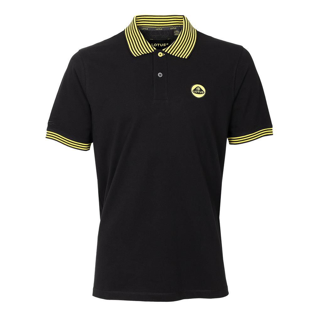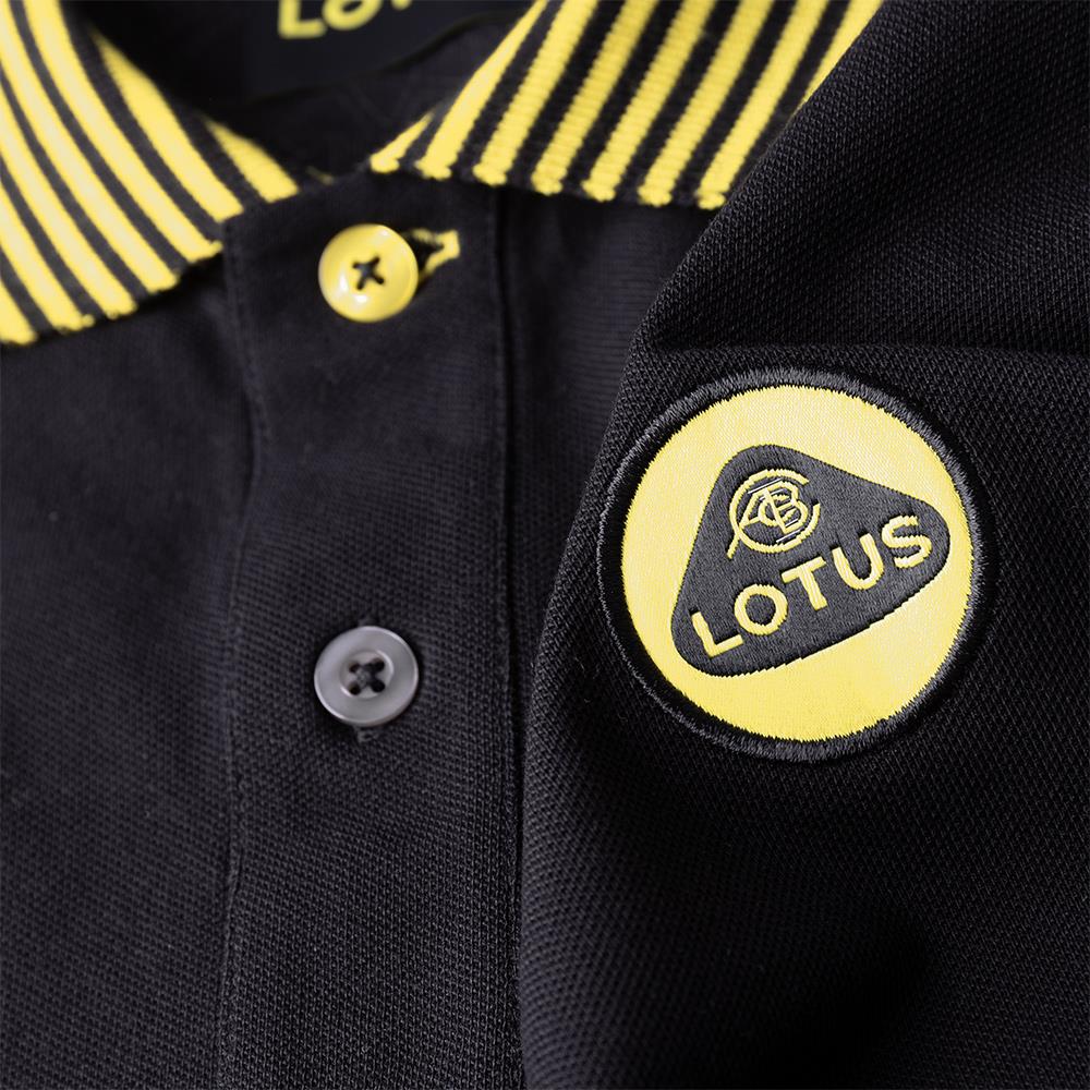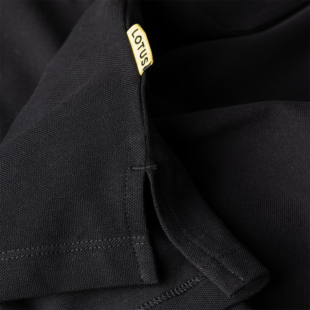 Polo Shirt schwarz mit Lotus Roundel auf der Brust und kleiner abstrakten Flaggen-Stickerei am Ärmel.