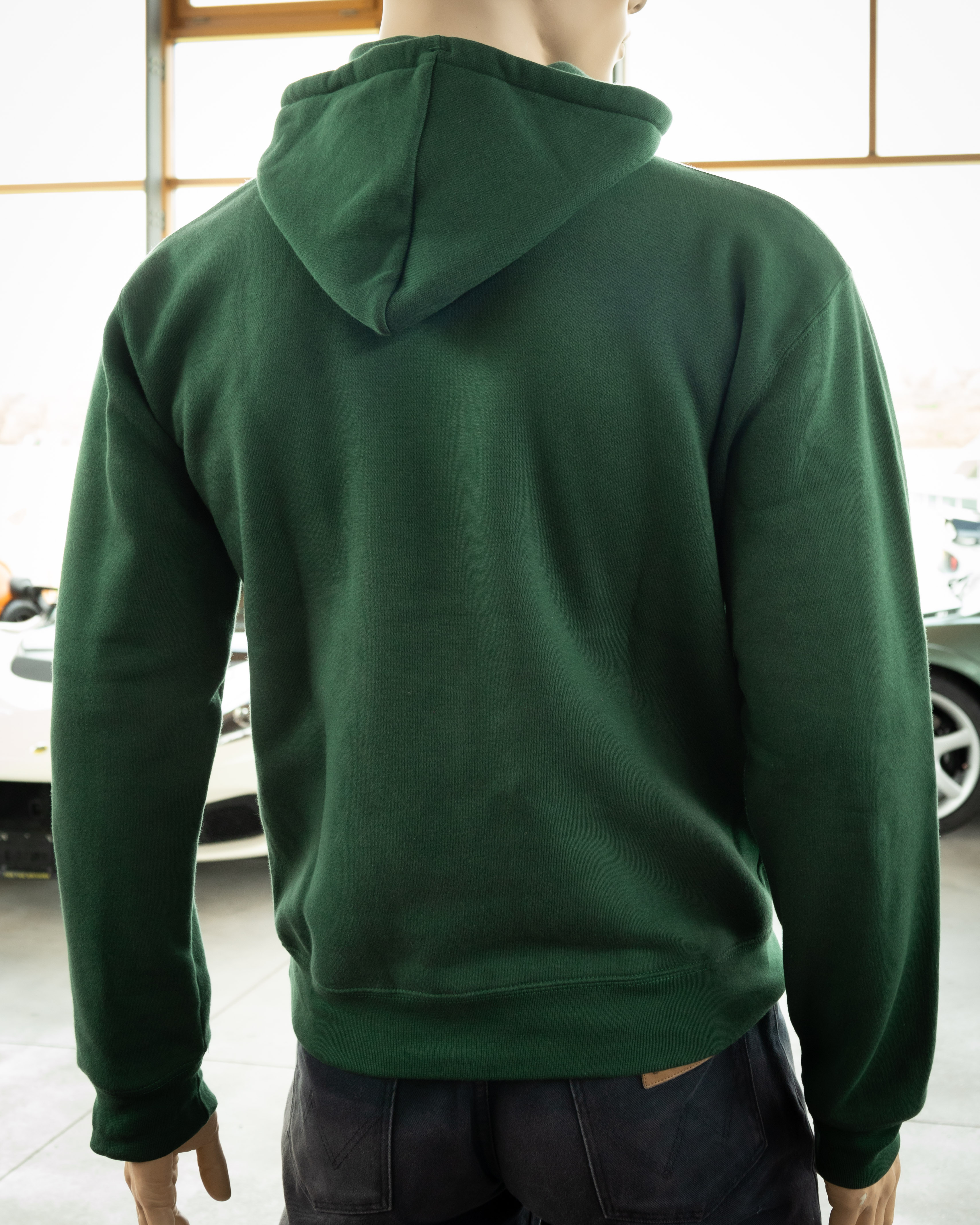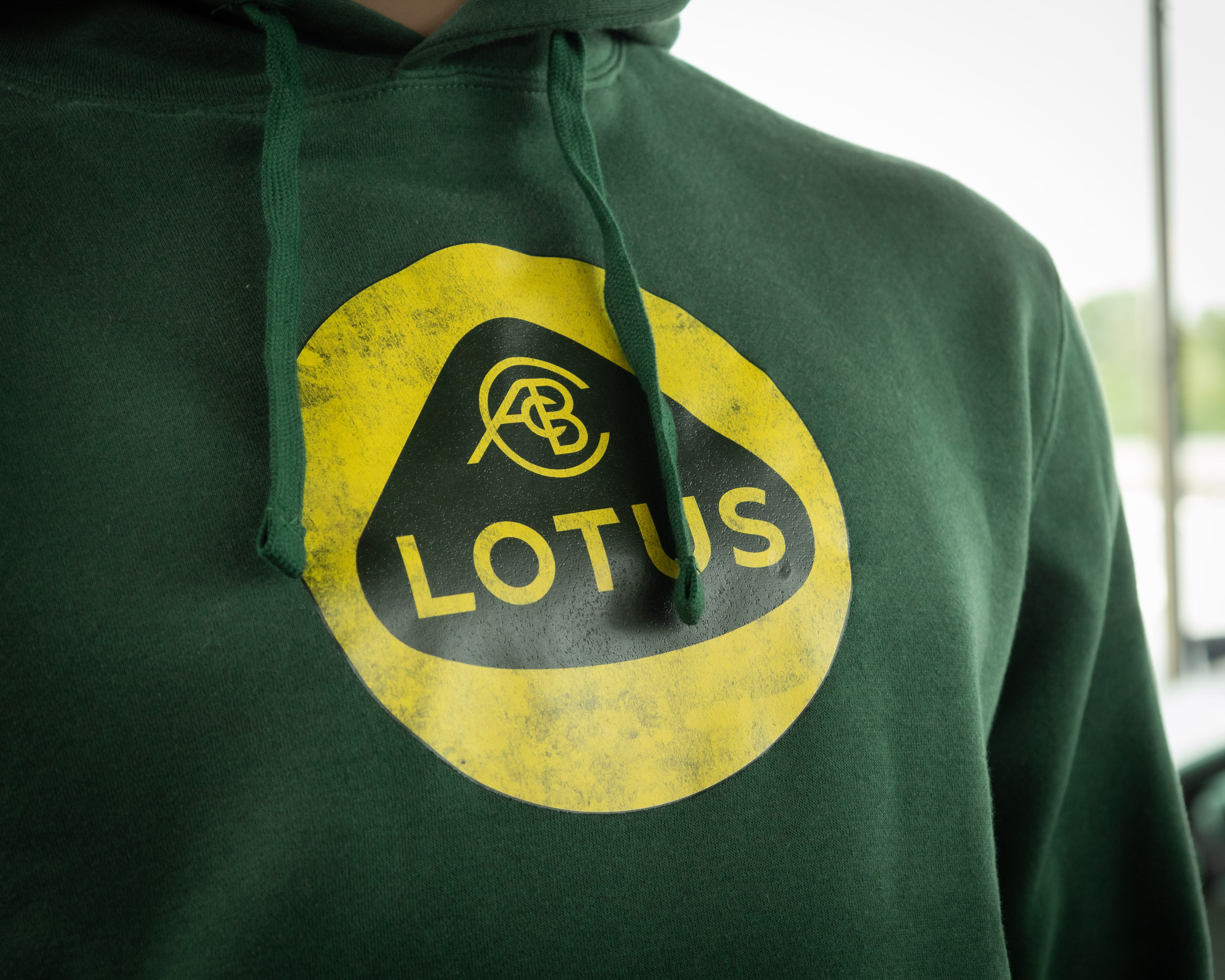 A casual bottle green hoody with a bullet bag. The hoody has a big printed vintage lotus logo in front.