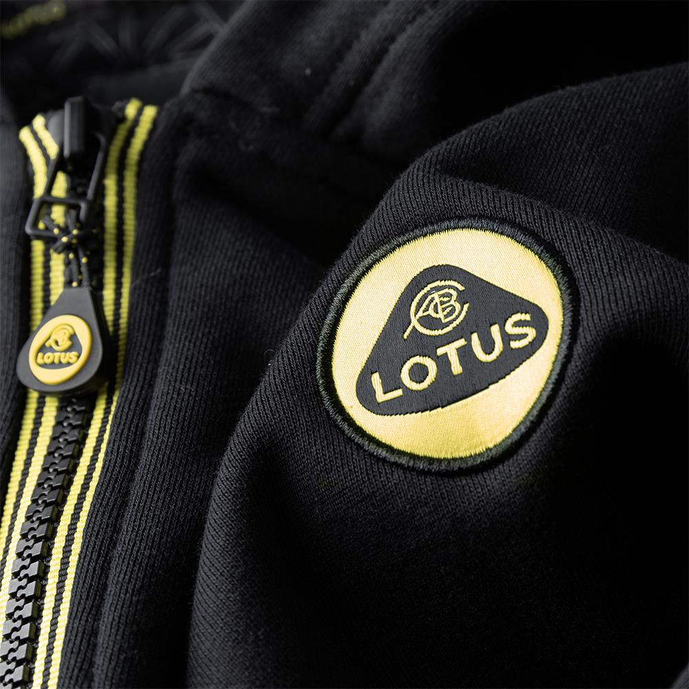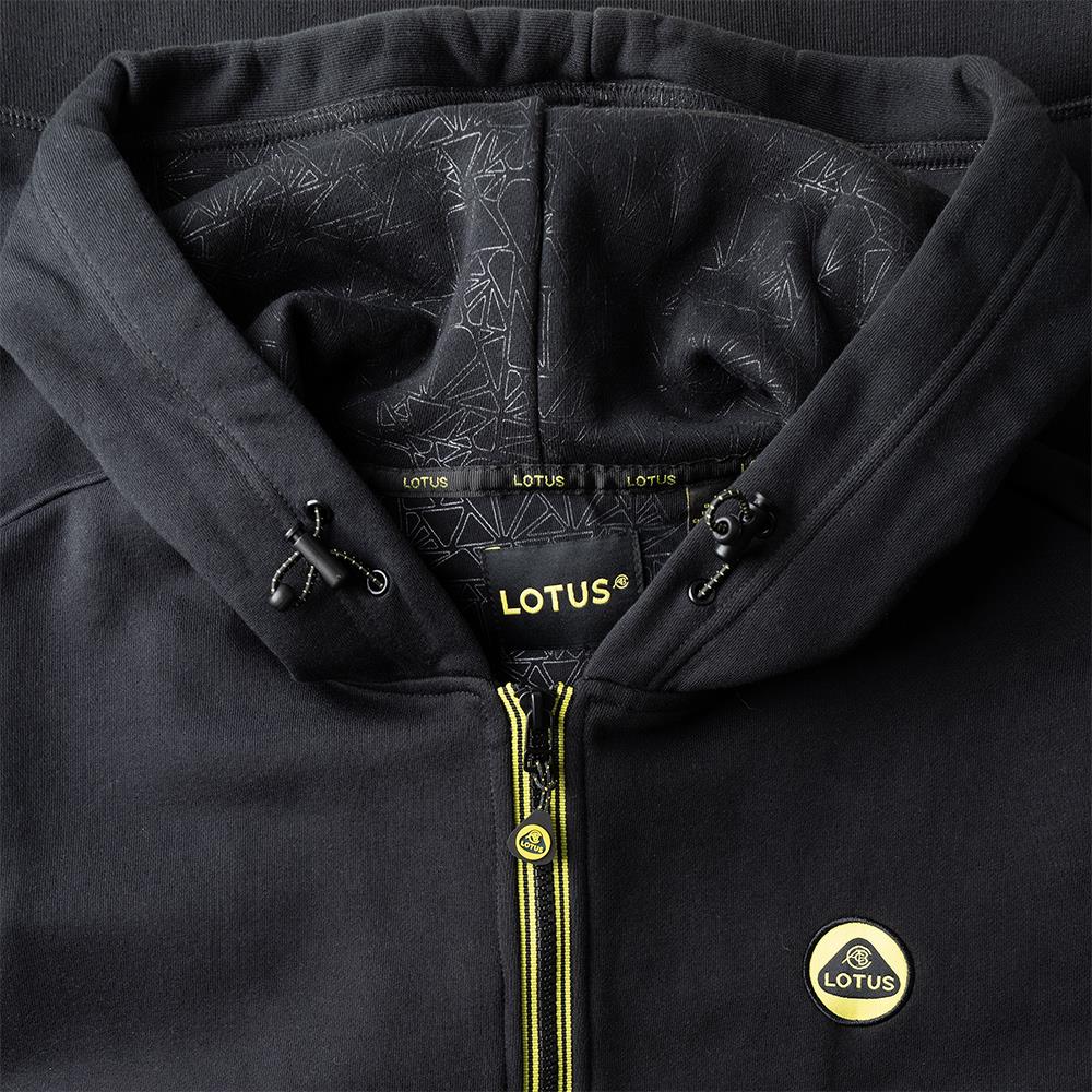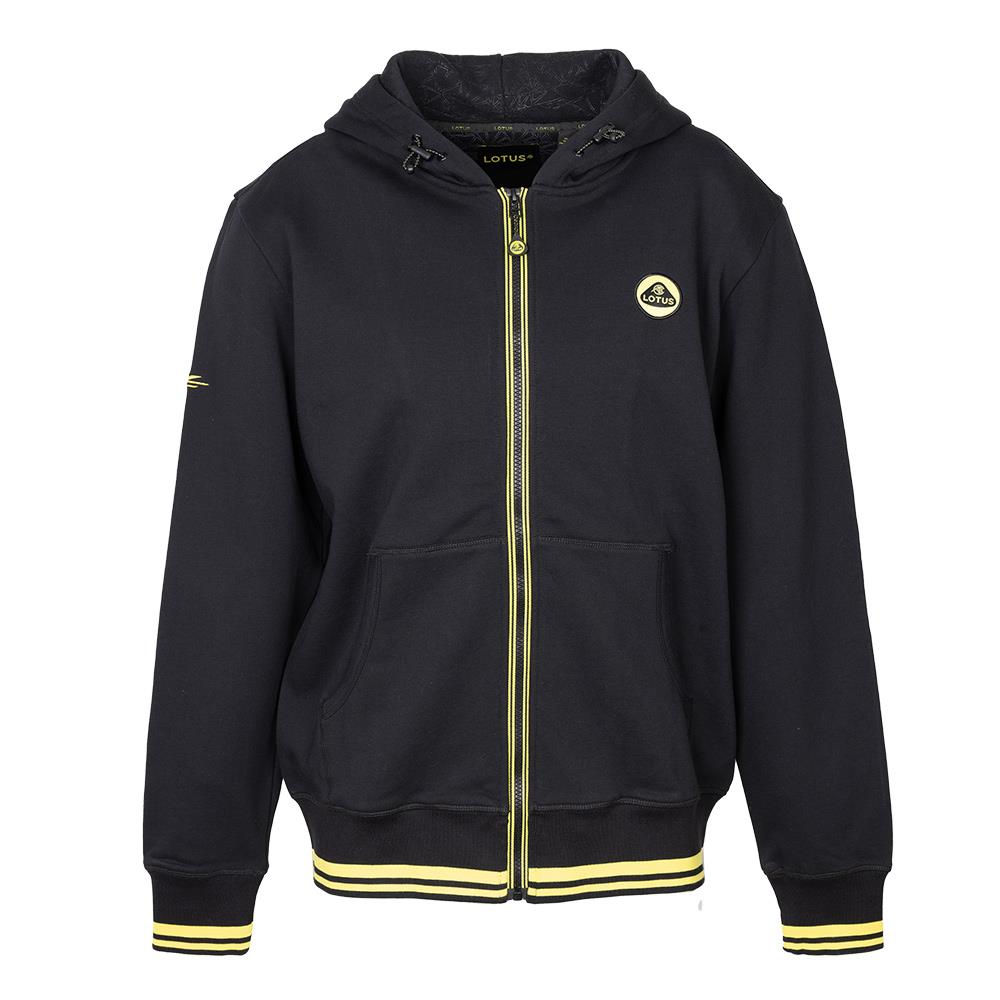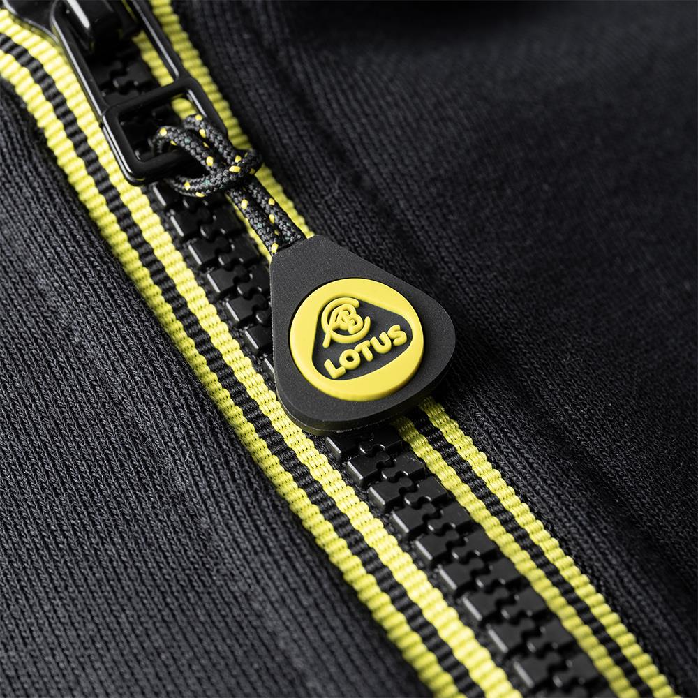 100% Cotton fleece back full zip sweat shirt, features LOTUS yellow striped zip tape, branded silicone zip puller, LOTUS roundel woven logo on the chest and weave pattern on the inner hood lining