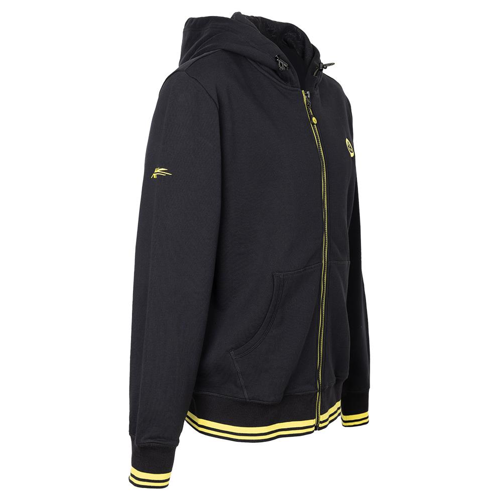 Sweatshirt Jacke mit durchgehendem Reißverschluss und Kapuze aus 100% Baumwollfleece, mit gelb gestreiftem LOTUS-Reißverschlussband, gewebtem LOTUS-Logo auf der Brust und Webmuster auf dem Innenfutter der Kapuze. Ärmelbündchen und Bund sind gelb/schwarz gestreift. Der superbequeme Alleskönner hat jeweils rechts und links zwei große Taschen.