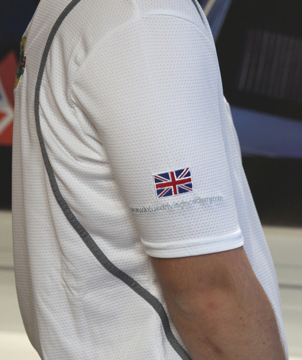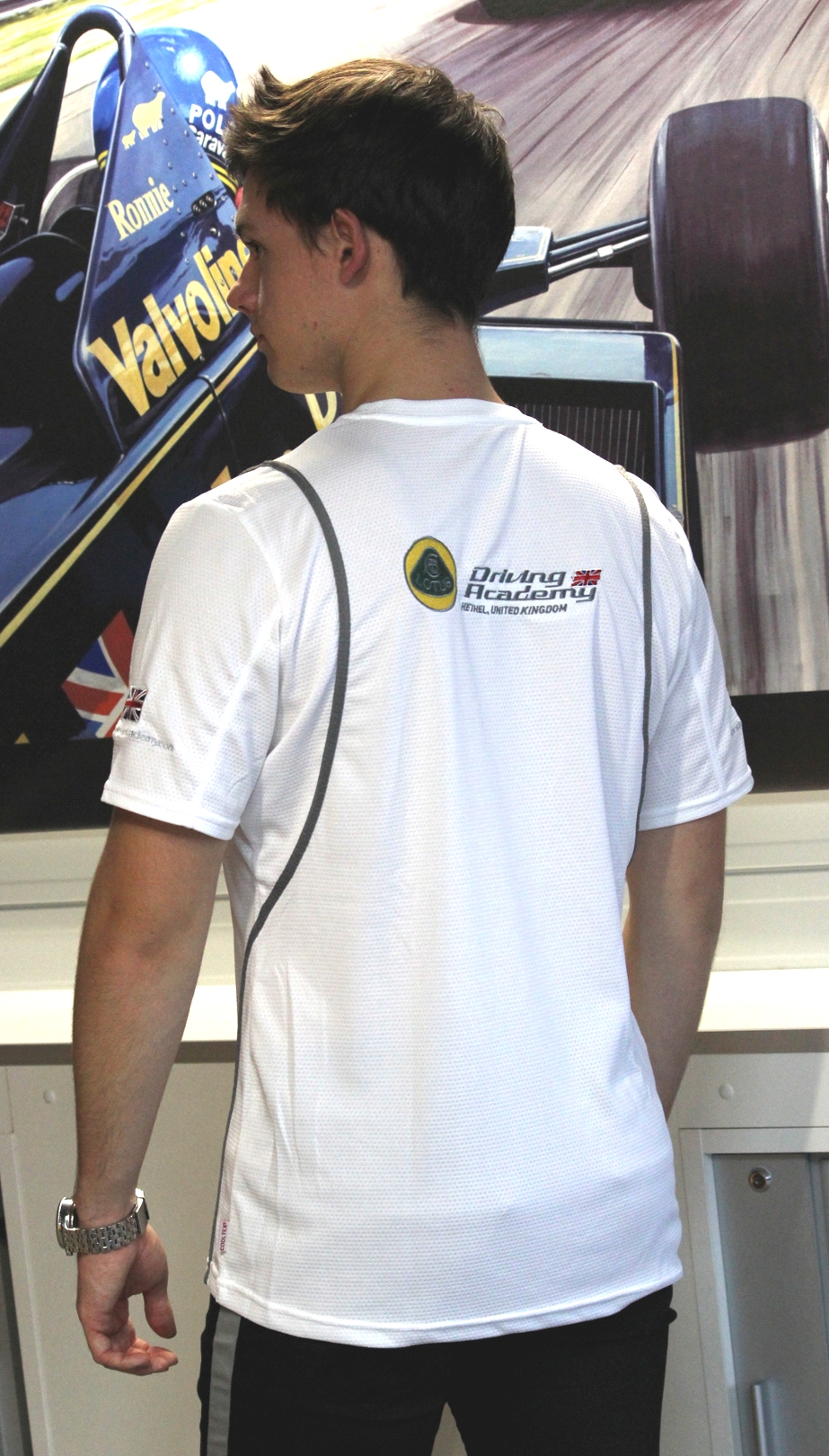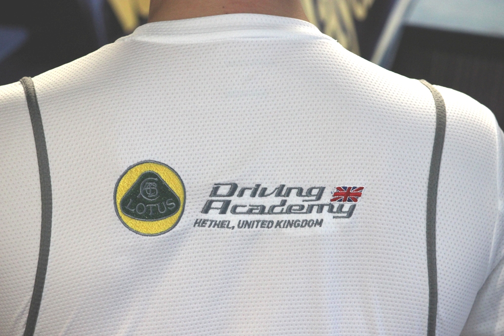 White Gamegear T Shirt with Lotus Driving Academy logo on front left breast and back.