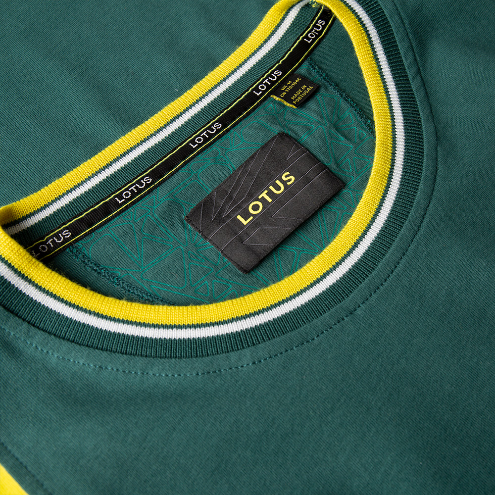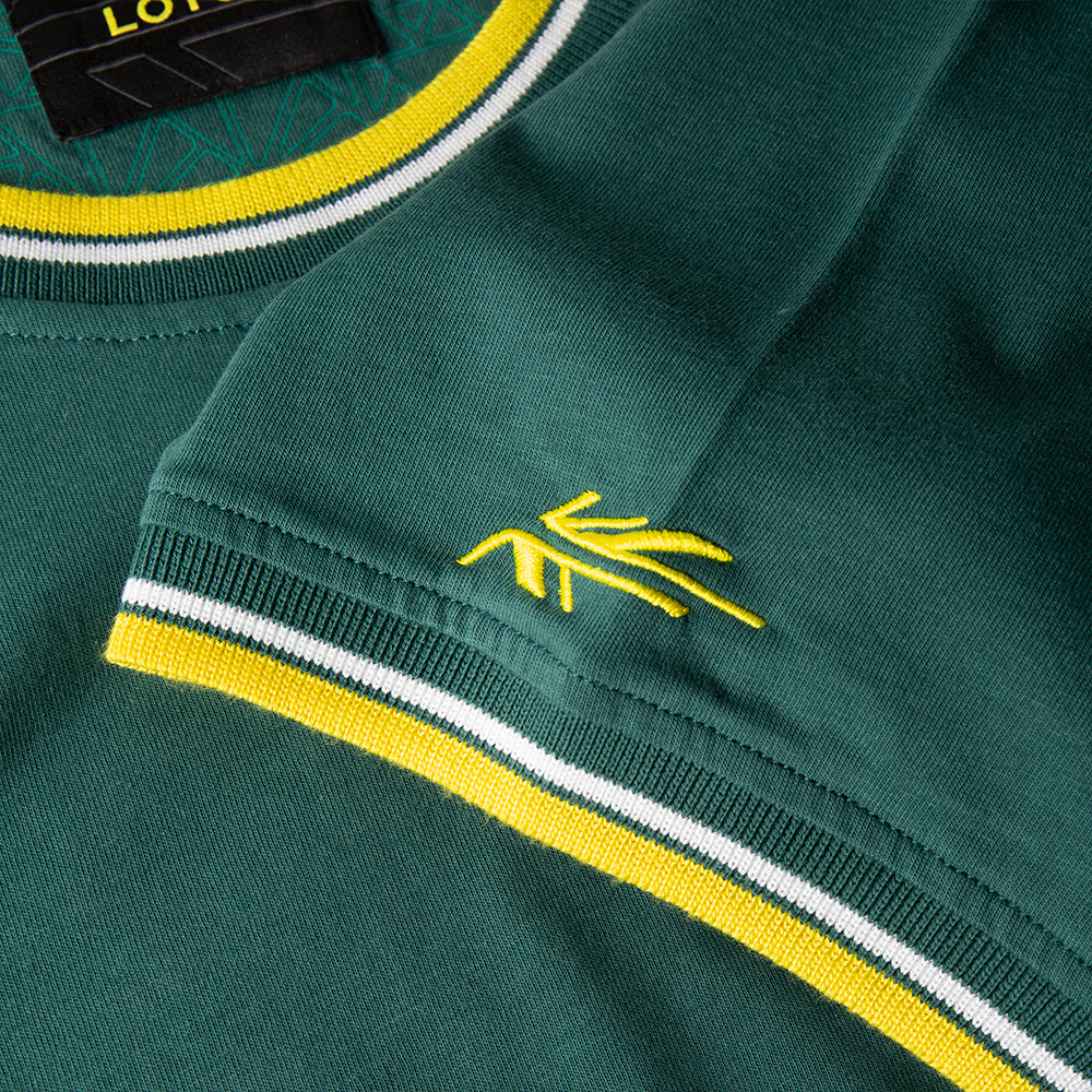 T-Shirt in grün with yellow strip, embroidery on the sleeve and Lotus logo on the chest.