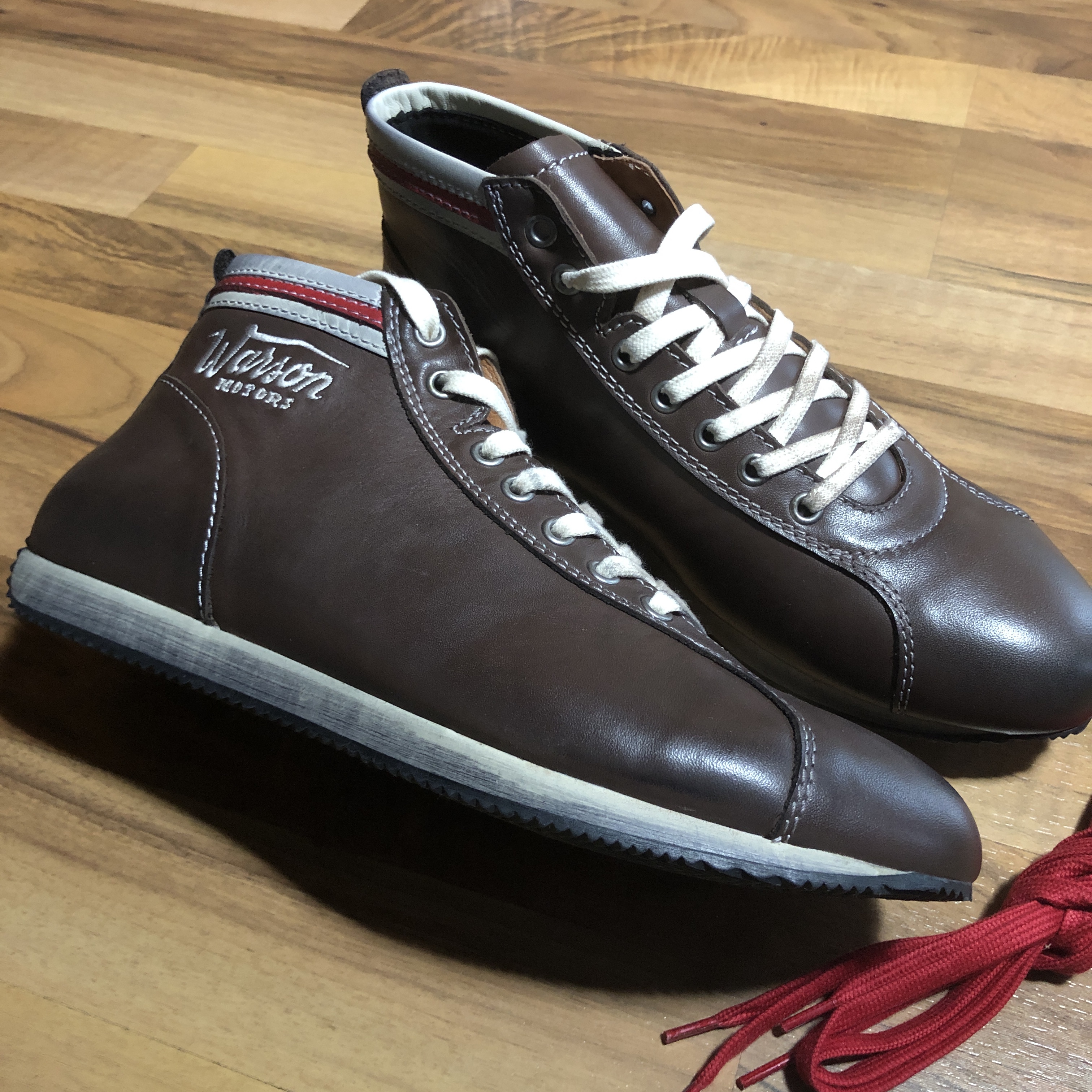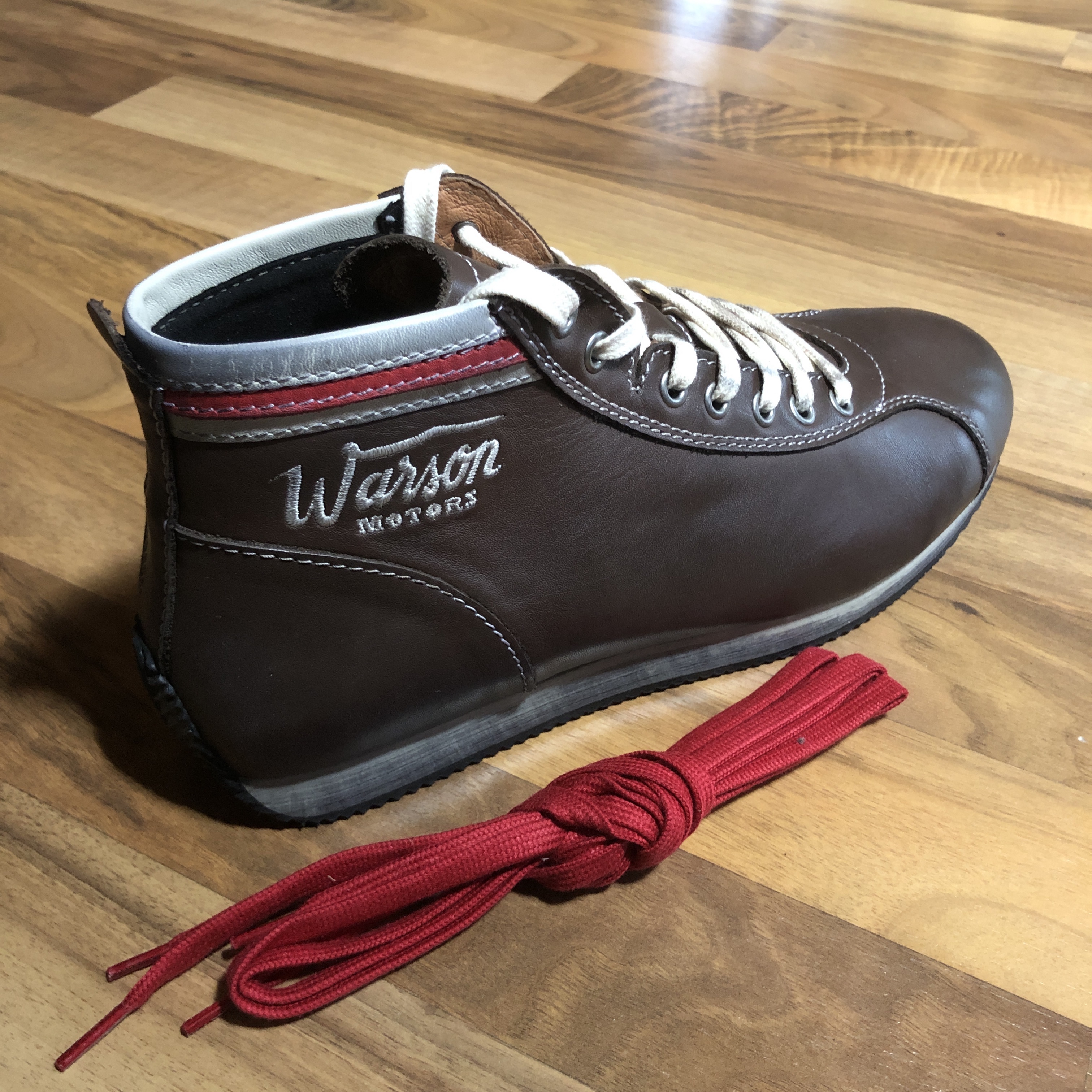 Hoher Sneaker Schuh im klassischen Vintange Motorsport Design, inspiriert von den Fahrerschuhen aus den 70er Jahren.