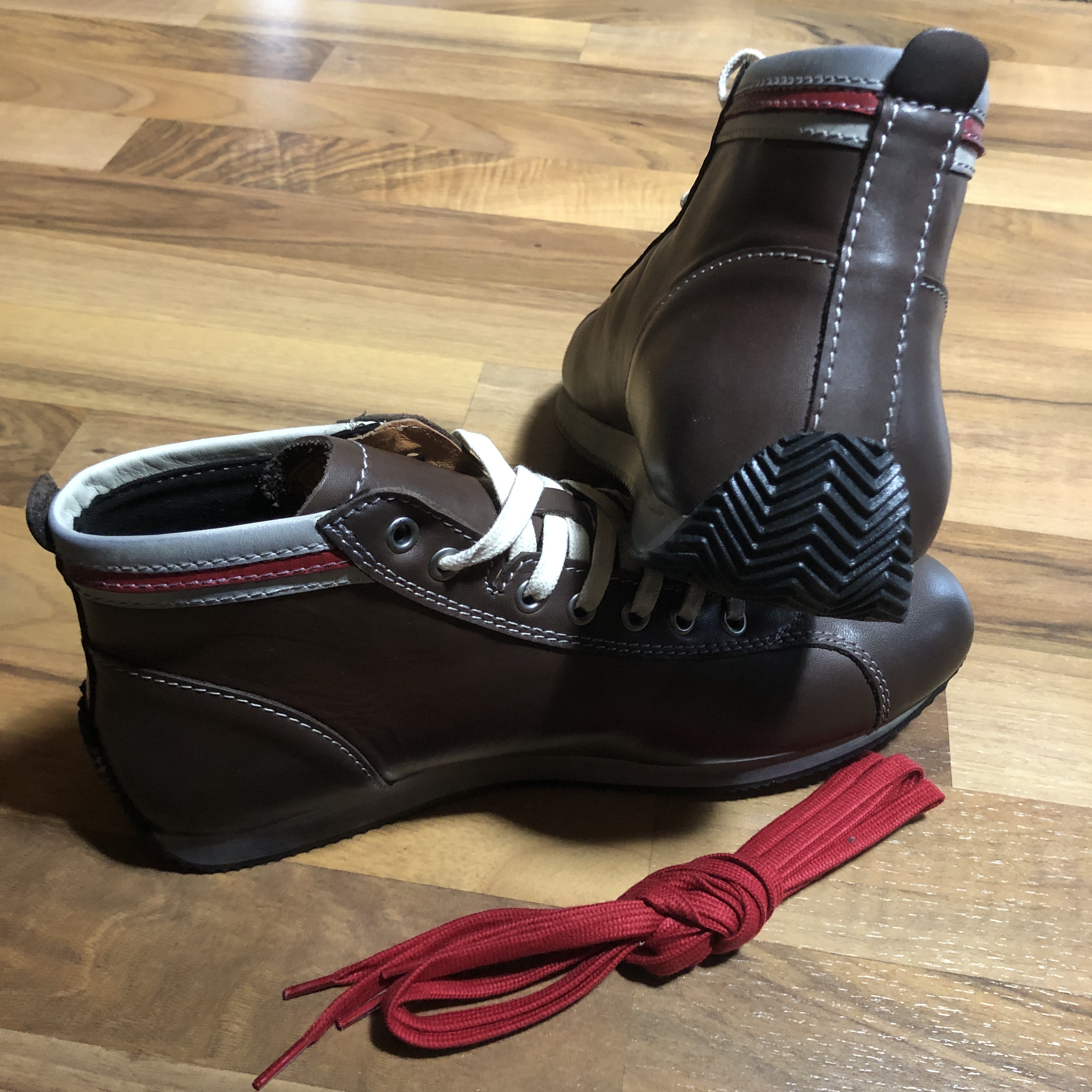 Innenfutter Leder und Stoff, herausnehmbare Innensohle, rote Schnürsenkel zum Wechseln.