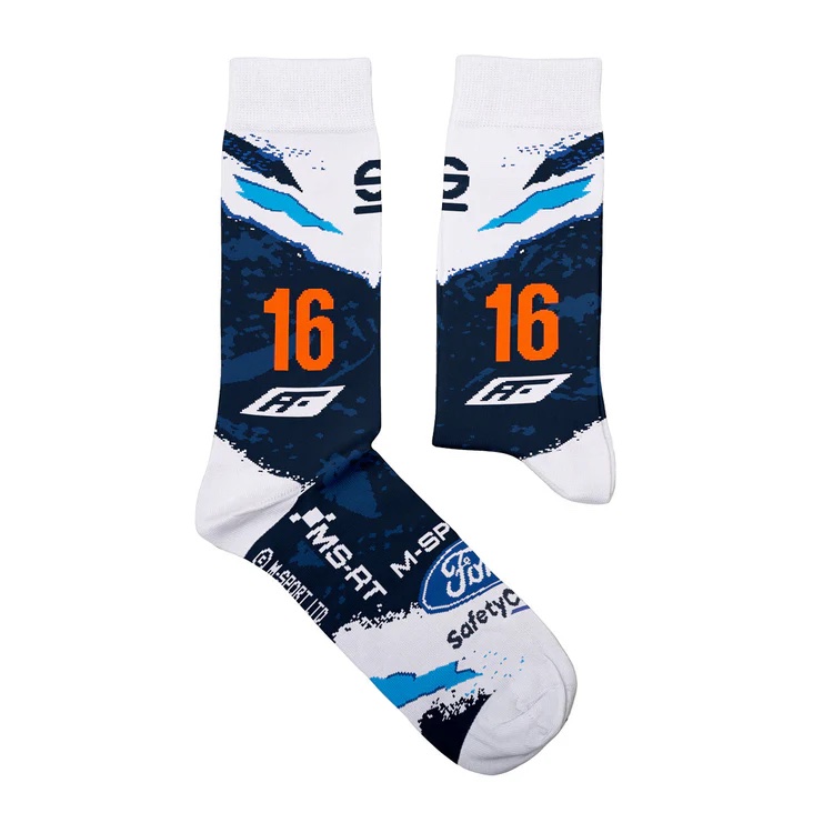 Diese Socken wurden in enger Zusammenarbeit mit M-Sport entwickelt und sind eine Hommage an den französichen Rallye Fahrer Adrien Fourmaux' 2024 Ford Puma Rally1.