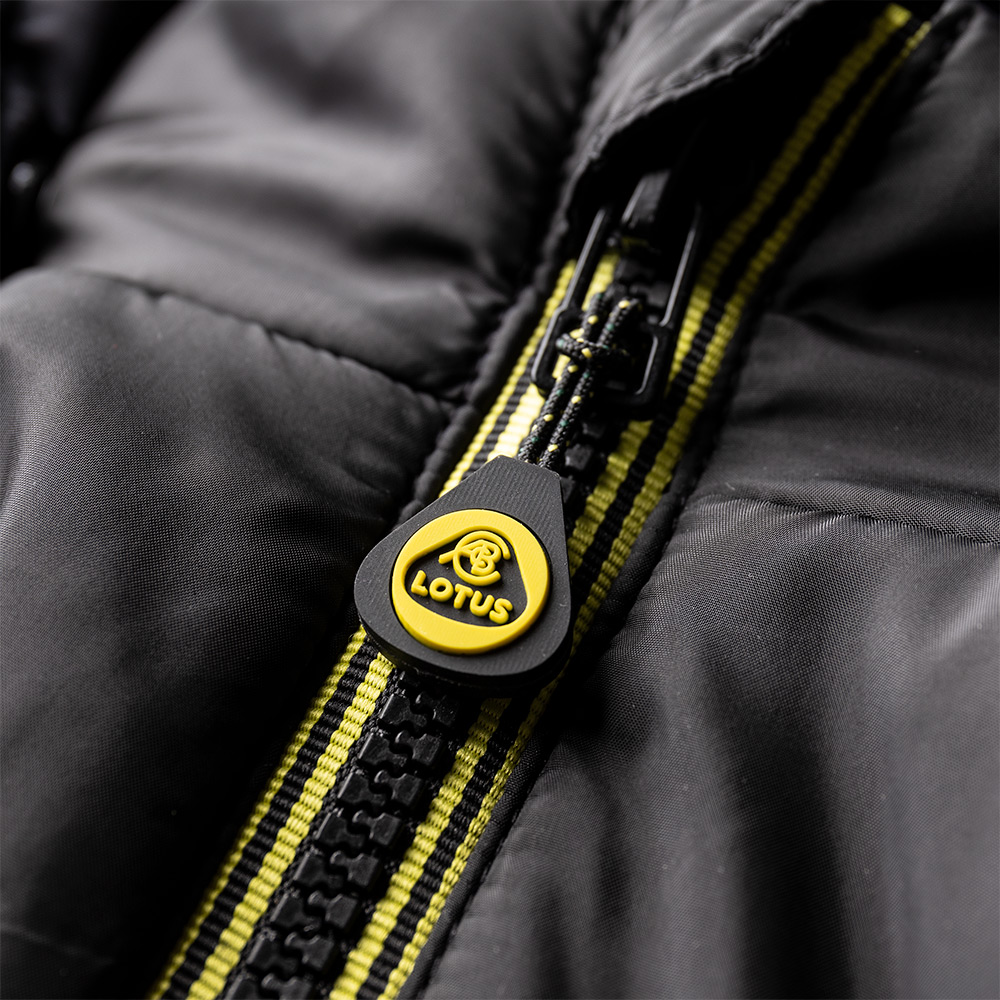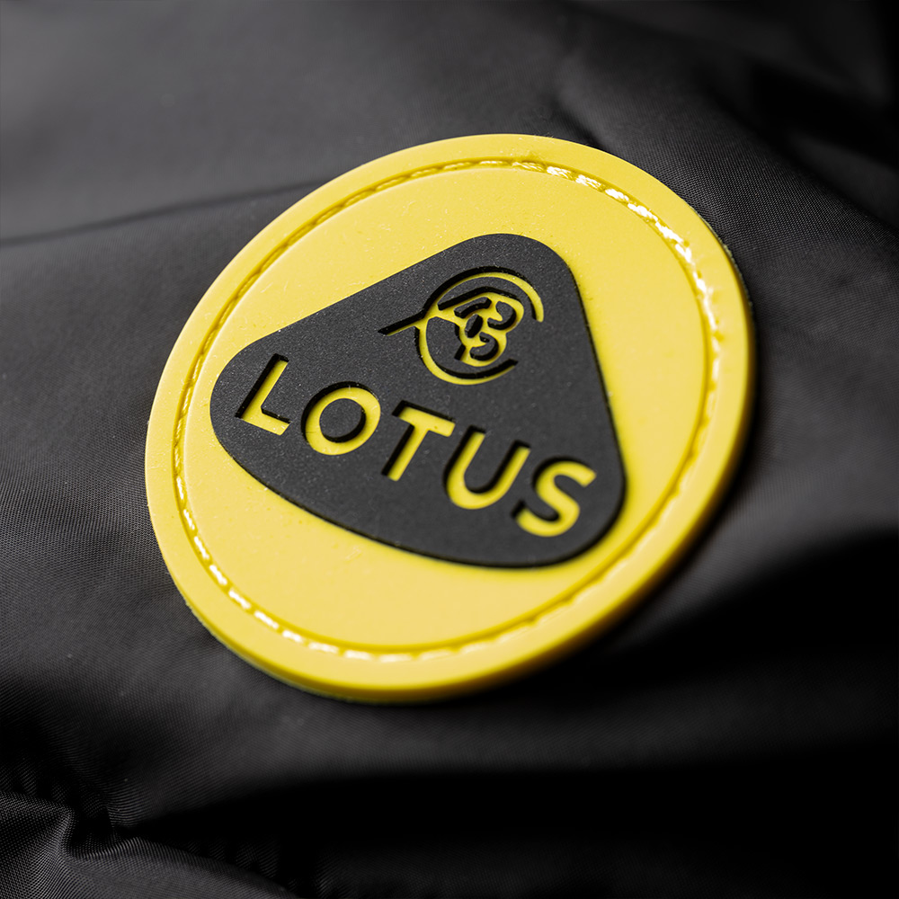 branded silicone zip puller, Lotus Roundel silicone logo on the chest and Lotus print on the lining.