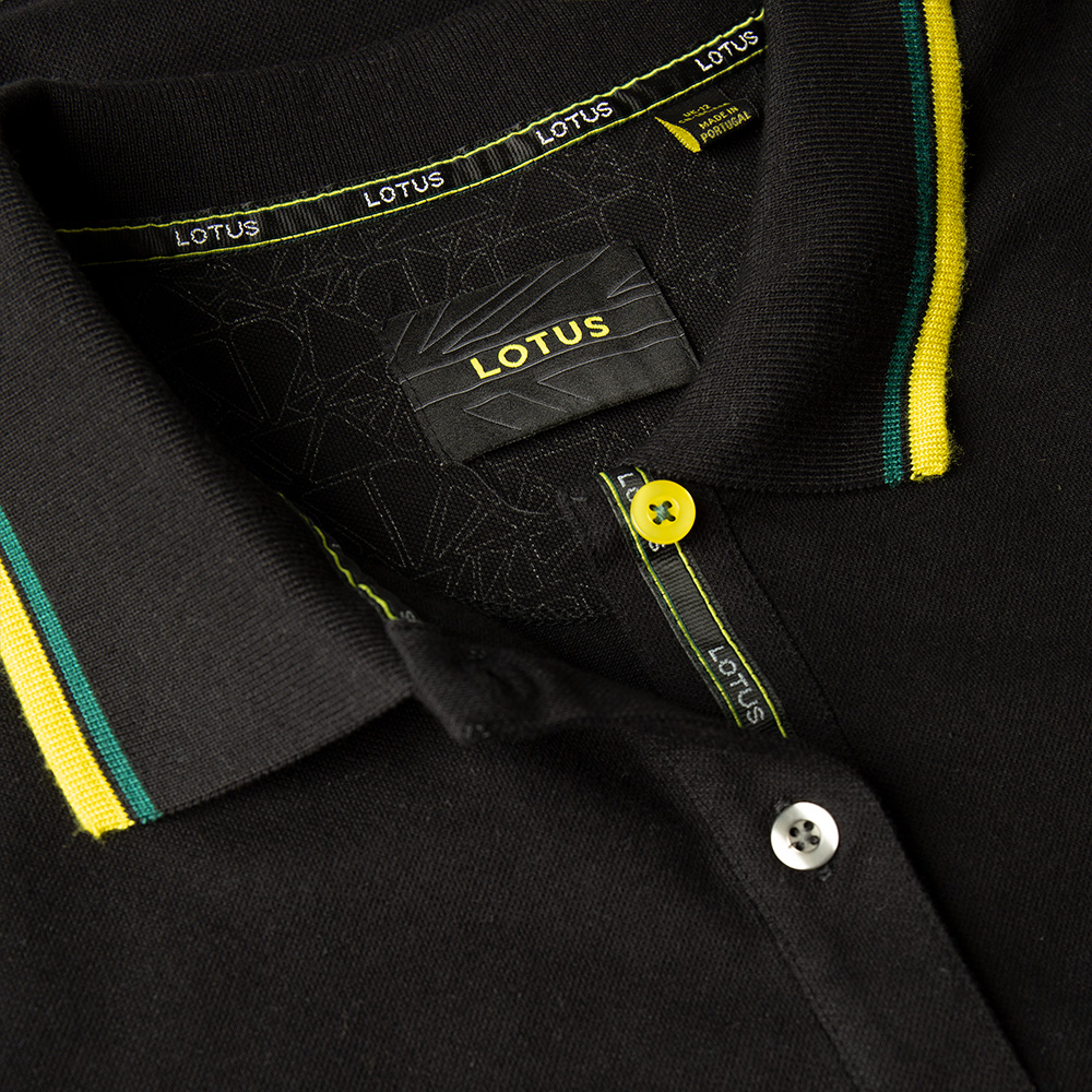 Polo shirt in black with yellow / green stripes on the sleeve and collar and Lotus logo on the chest.