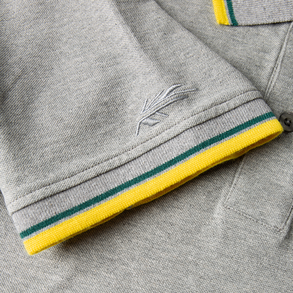 Polo-Shirt in grau mit gelb/ grünem Streifen am Ärmel und Kragen und Lotus Logo auf der Brust