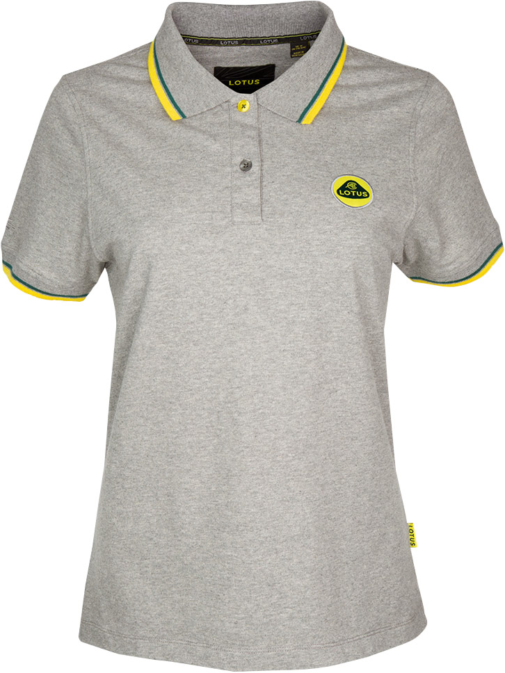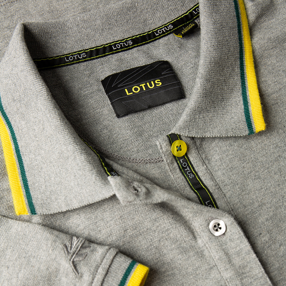 Polo shirt in grey with yellow /green stripes on the sleeve and collar and Lotus logo on the chest.