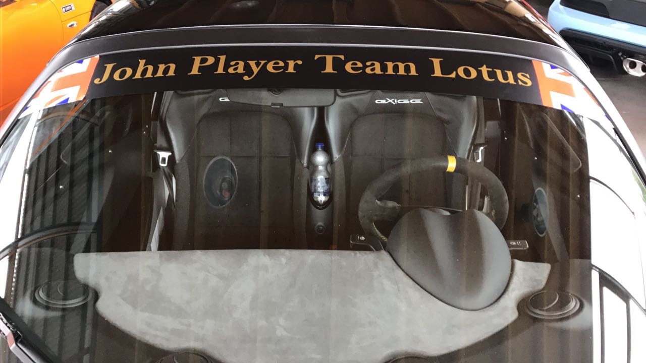 Scheibenstreifen in schwarz oder weiß mit Unionjack recht und links und dem Schriftzug "John Player Special Team Lotus", auch erhältlich ohne Schrift.