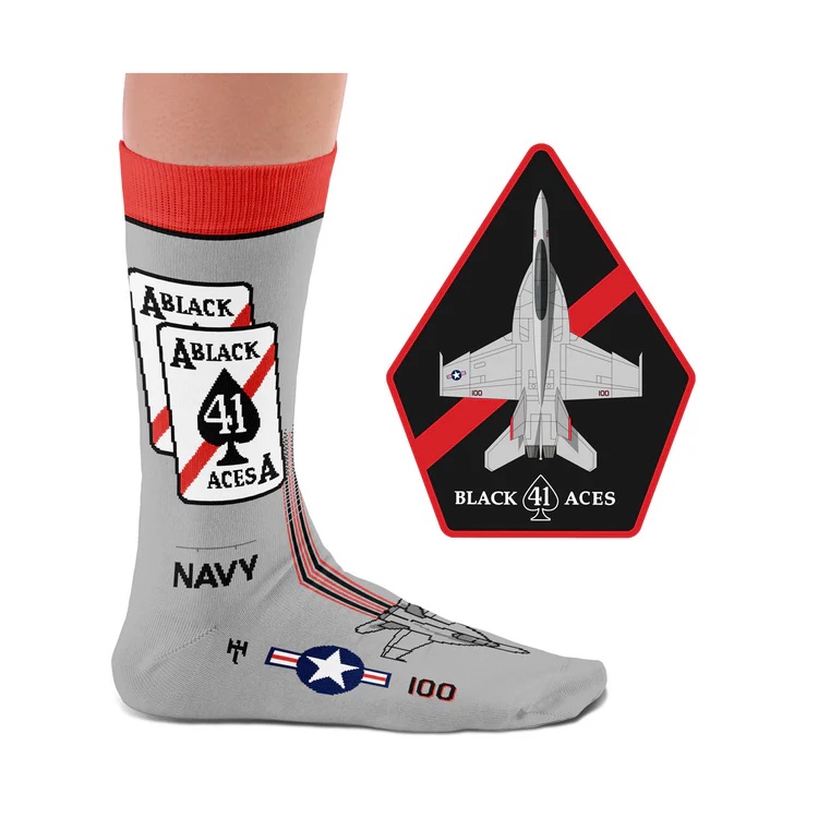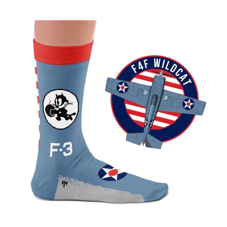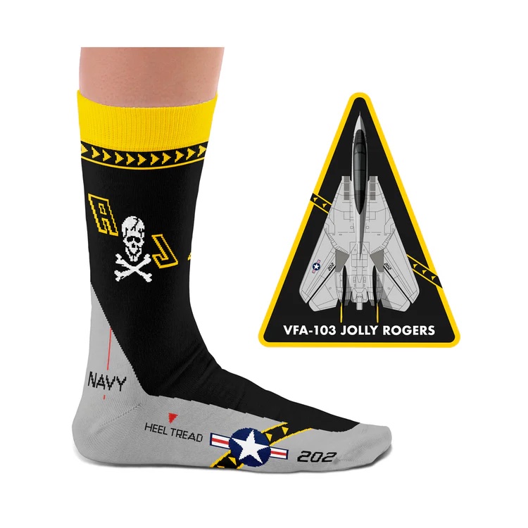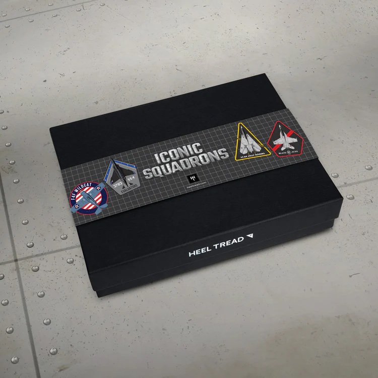 The Iconic Squadrons are a collector's pack of 4 pairs of socks featuring legendary US Navy squadrons such as the F4F Wildcat with Felix the Cat, Black Aces VF-41, VFA-J 103 Jolly Rogers, and the F-4 Phantom “Black Bunny” in a beautiful gift box.